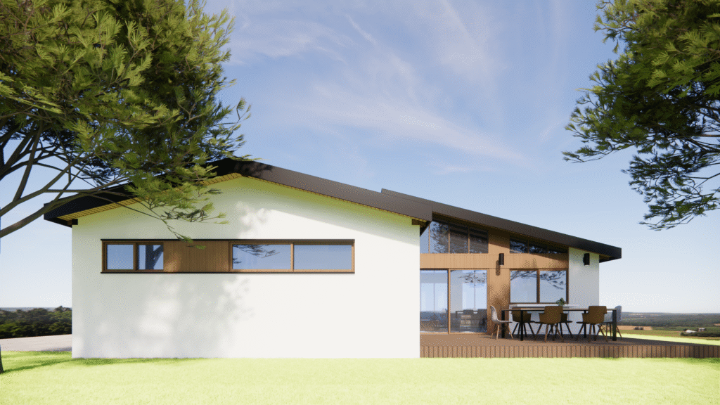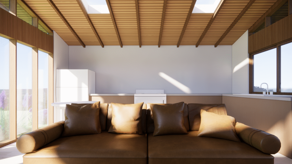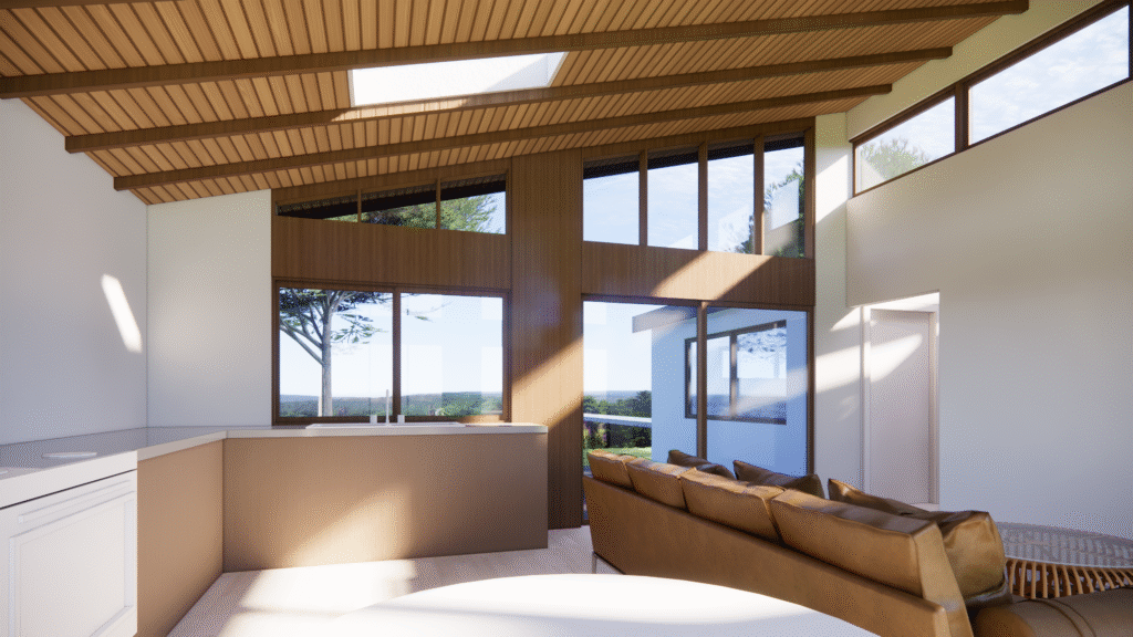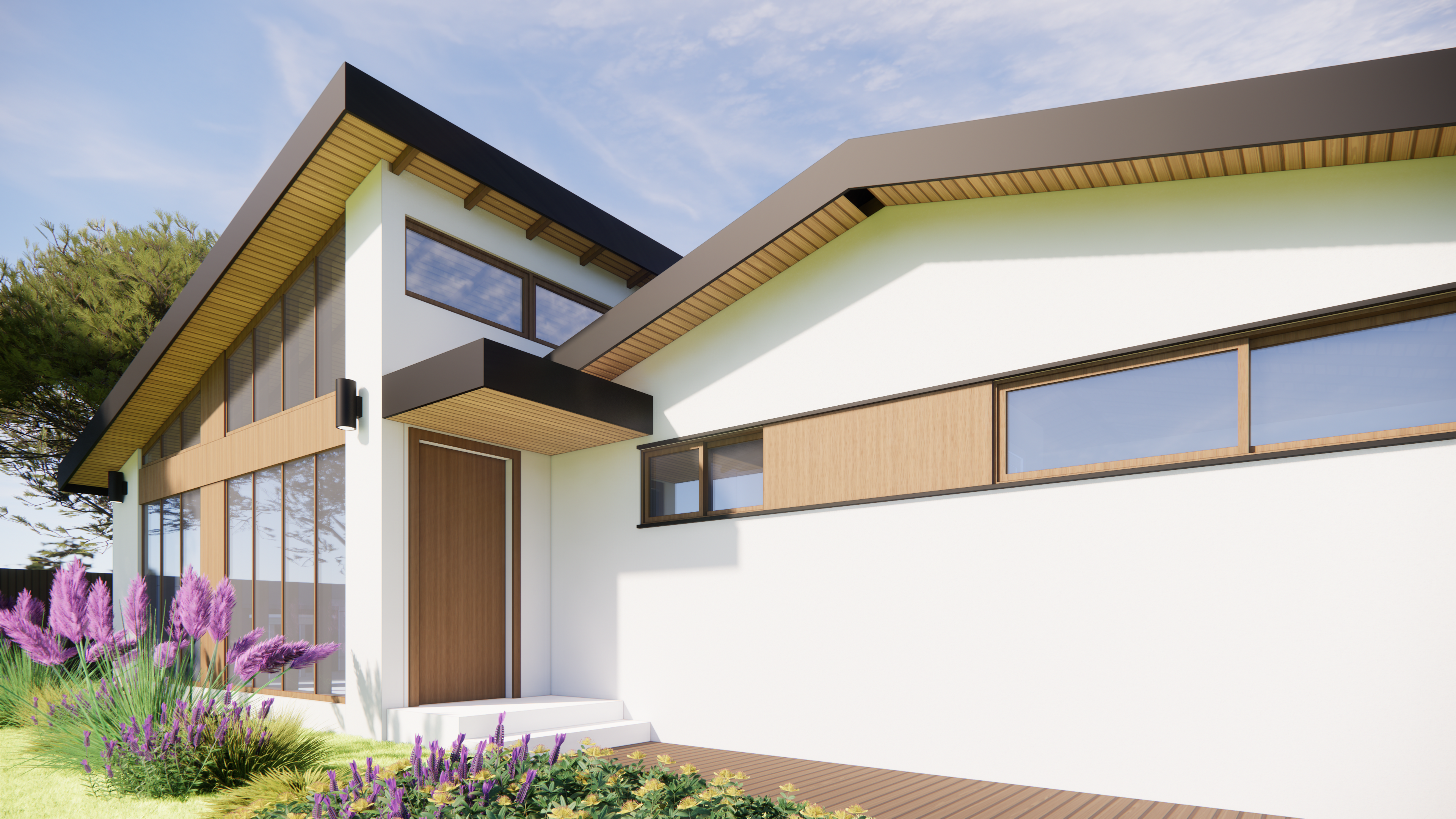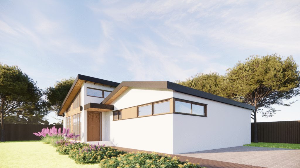 a contemporary design for a detached ADU with pitched roofs and clerestory windows. The project utilizes large format architecture window wall system while expressing the structure integrity to the facade design. This project values continuous lines and fine details at the exterior elements such as windows, trims, and entry porch, creating a holistic design approach. AI assist design is also utilized during the design phase to help the home owner visualize different material pallette and inspirations.